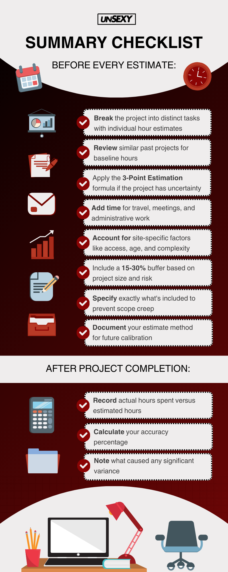 This approach prevents both under-bidding (which costs you money) and over-bidding (which loses you contracts). Most service contractors who estimate poorly either forget about setup and cleanup time, underestimate complexity, or fail to account for client changes.
