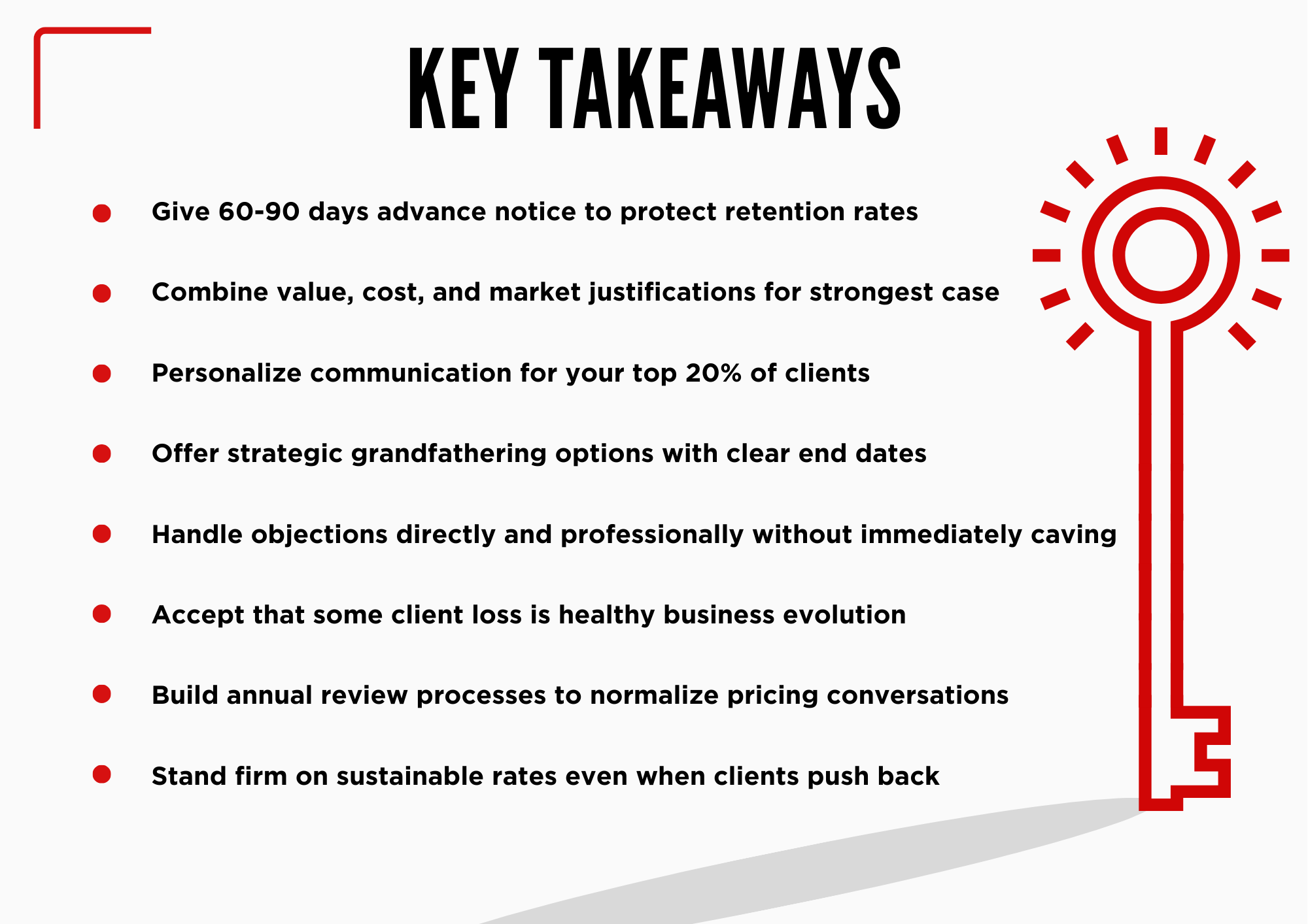Here's the truth: If clients leaving over 10-15% increases represent less than 20% of your revenue, the increase was successful. You've shed unprofitable relationships and positioned yourself for sustainable growth. That's not failure—that's smart business.