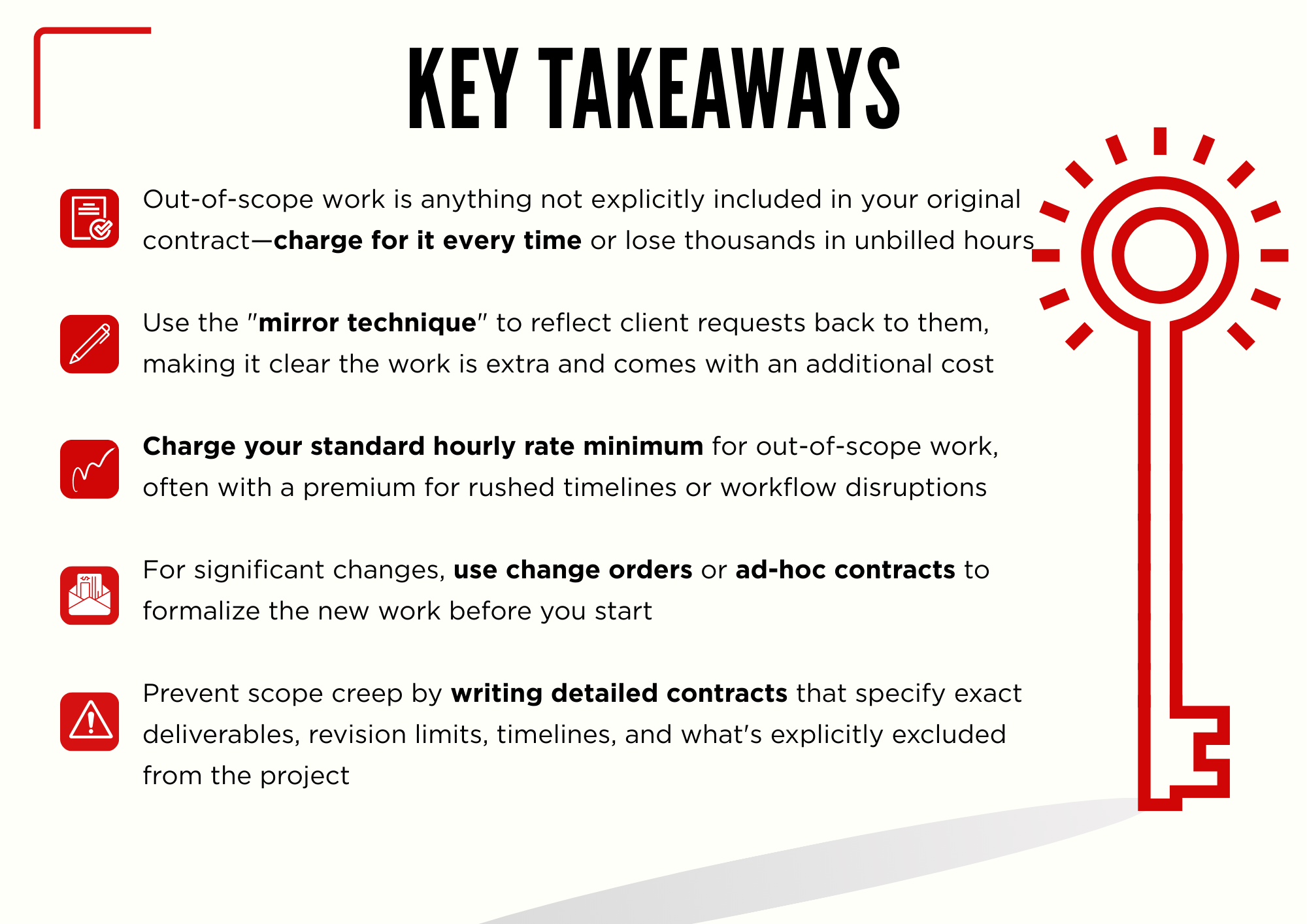 - Out-of-scope work is anything not explicitly included in your original contract—charge for it every time or lose thousands in unbilled hours